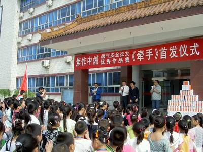 儀式上,焦作中燃公司領導協同焦作日報社副總編輯一道,為到場的200余名校園小記者頒發了《牽手》和《燃氣安全知識手冊》,并與他們合影留念。