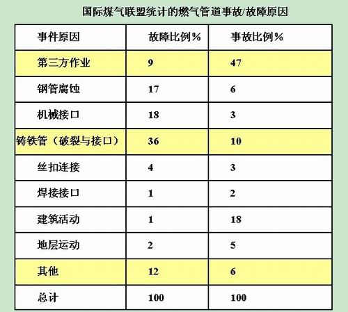 數據顯示,雖然第三方作業造成燃氣管道故障的比例只有9%,但是因其造成的事故總數卻占所有燃氣事故的47%。即使在燃氣事業發展相對成熟的歐美國家,第三方破壞事故的預防亦是有待解決的重要課題。如歐洲燃氣管道事故原因的統計比例中第三方損害占50%,美國的稍低、但也達到了39%。因此,隨著城市市政工程的不斷展開,第三方作業損害預防工作的開展應引起我們的高度重視,加強巡線管理應成為當務之急。
