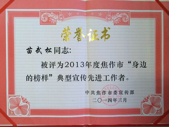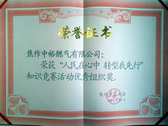 焦作公司訊 由于在焦作市總工會舉辦的“人民在心中,轉型我先行”主題實踐活動及焦作市委宣傳部開展的“身邊的榜樣”宣傳活動中表現突出,日前,焦作公司被焦作市總工會、焦作市委宣傳部分別授予了“知識競賽活動優秀組織獎”、 “身邊的榜樣典型宣傳組織工作獎”,焦作公司員工苗武松被授予了“身邊的榜樣典型宣傳先進工作者”榮譽稱號。