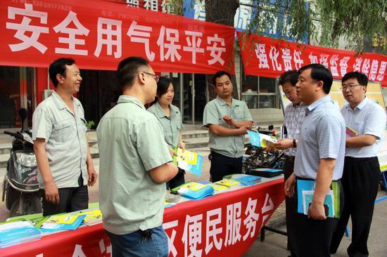 焦作公司訊 2014年6月16日,修武中裕燃氣發展有限公司組織員工走上街頭,針對安全用氣知識對廣大居民提供宣傳咨詢服務。通過設立宣傳點、懸掛橫幅、擺放展板,向過往群眾發放宣傳資料,接受用戶用氣安全咨詢等方式加強燃氣安全宣傳。期間,修武縣吳利年副縣長來到宣傳點針對如何安全用氣進行了詳細的咨詢和提問,對工作人員的回答予以了高度評價,同時提出了盡快推行居民灶具管道硬連接以杜絕安全隱患等要求。活動為廣大市民進一步了解了如何安全使用燃氣及燃氣泄露后如何處置等安全常識、提高燃氣使用安全意識和操作技能提供了幫助。
