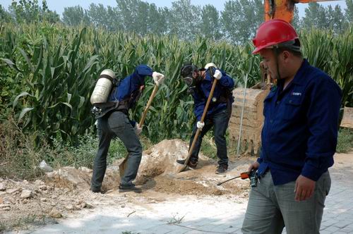 約15分鐘后,濟(jì)源公司搶險(xiǎn)人員及外部救援隊(duì)伍陸續(xù)抵達(dá),指揮組與各小組不斷傳遞指令、匯報(bào)情況。本著“先控制事態(tài)發(fā)展,再降壓焊接搶險(xiǎn)”的原則,拉警戒線、疏散行人,強(qiáng)制通風(fēng)、聯(lián)系用戶、管道降壓、消防隊(duì)員用消防水稀釋漏氣處的空氣等一系列工作在統(tǒng)一調(diào)度下緊張有序地實(shí)施……