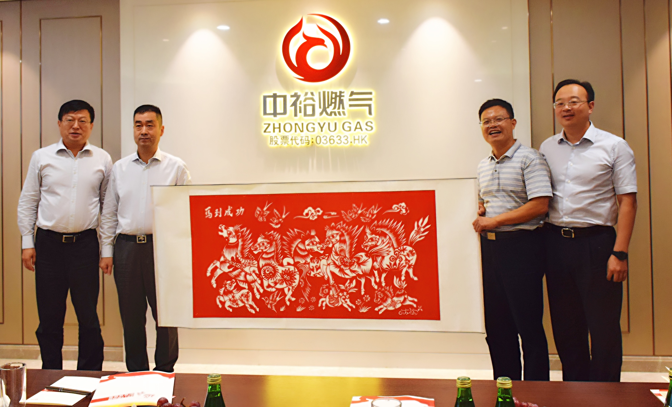 會談結束時,楊市長一行特地向中裕燃氣送上一幅題為《馬到成功》的陜西特產“剪紙畫”,寓意延安市政府與中裕燃氣的合作也將馬到成功。雙方領導本次會面為中裕燃氣開疆拓土、發展新業務提供了良好契機。